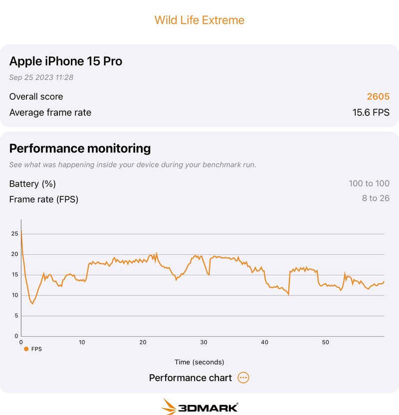 3DMark Wild Life Extreme での Apple iPhone 15 Pro の計測結果