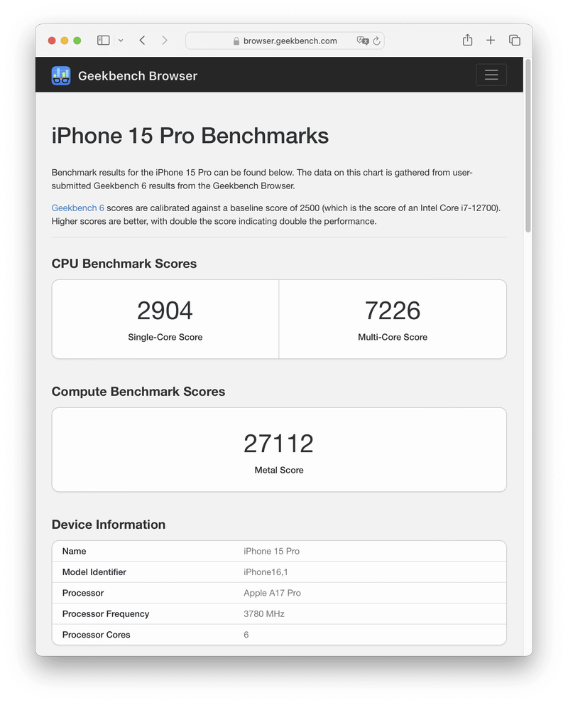 GeekbenchはiOSの定番ベンチマークアプリです。Geekbenchが公開している結果によると、iPhone 15 Pro のCPU計測結果は Single-Core Score が2,904、Multi-Core Score が7,226です。iPhone 15 Pro のCPUは A17 Pro、以前使っていた iPhone 12 Pro のCPUはA14で、 iPhone 12 Pro のCPU計測結果は Single-Core Score が2,020、Multi-Core Score が4,511なので、A17 Pro はA14に比べて60%ほど速いようです。CPU性能的にも買い替える価値があったと言えるでしょう。