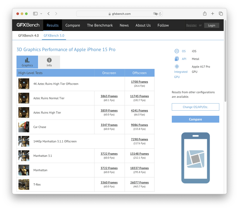 GFX Bench Metal は3Dゲームベンチマークアプリです。GFX Bench が公開している結果によると、Aztec Ruins High Tier Offscreen の iPhone 15 Pro の計測結果は 3,112 Frames / 48.4 FPS でした。iPhone 12 Pro の計測結果は 1,858 Frames / 28.9 FPS なので、67%ほど速いようです。iPhone 15 Pro の結果は NVIDIA GeForce GTX 1050 の結果くらいです。