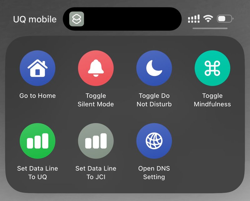 一方、Proにしかないアクションボタンは1個の機能しか設定できないとなると微妙ですが、ここにShortcutアプリのフォルダーを割りあてると、いろいろな機能を2タップで実行できるようになります。たとえばサブ回線への切り替えや、アドブロックしているDNSサーバーを通常のDNSサーバーに切り替えるための画面を表示する、などができます。