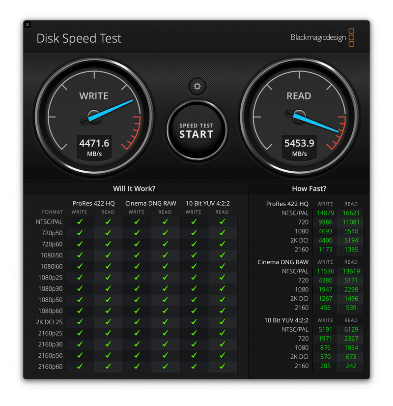 Blackmagic Disk Speed Test もストレージベンチマークアプリです。3.3での計測結果は、Readで4,471.6MB/s、Writeで5,453.9MB/sとなりました。