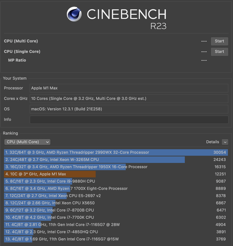 Cinebench R23 での Apple Mac Studio (2022) / Apple M1 Max (10-Core CPU, 32-Core GPU, 16-Core Neural Engine) の Multi Core CPU 計測結果