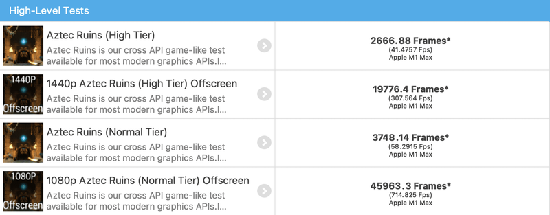 GFX Bench Metal: Aztec Ruins での Apple Mac Studio (2022) / Apple M1 Max (10-Core CPU, 32-Core GPU, 16-Core Neural Engine) の計測結果
