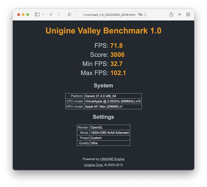 Valleyでの Apple Mac Studio (2022) / Apple M1 Max (10-Core CPU, 32-Core GPU, 16-Core Neural Engine) の計測結果