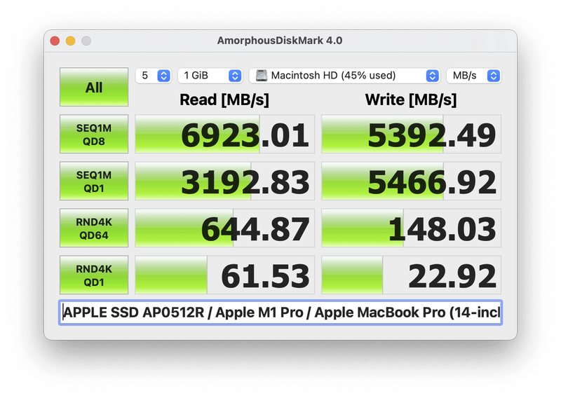 AmorphousDiskMarkでの Apple MacBook Pro (14-inch, 2021) の計測結果