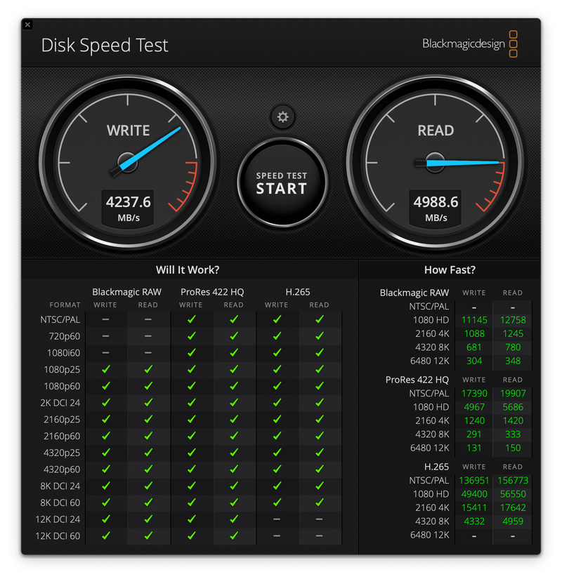 Blackmagic Disk Speed Test もストレージベンチマークアプリです。3.4.1での計測結果は、Readで4,988.6MB/s、Writeで4,237.6MB/sとなりました。