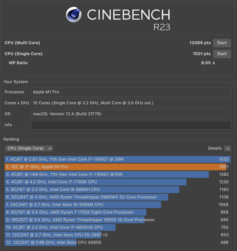Maxon Cinebench はCPUベンチマークアプリです。R23.200での計測結果は、Single Core が1,501で、Intel Core i7-1165G7 (4-Core, 2.8GHz) と同等、Multi Core が12,086で、Intel Core i9-9880H (8-Core, 2.3GHz) の1.33倍でした。
