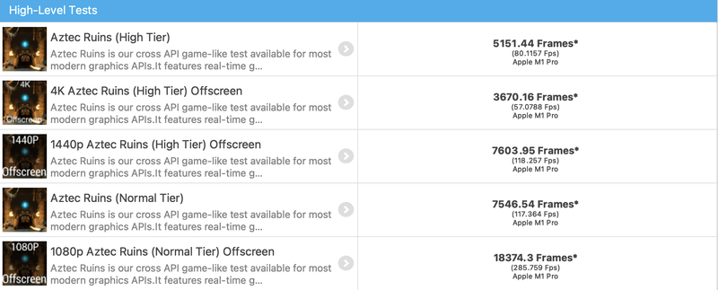 GFX Bench Metal: Aztec Ruins での Apple MacBook Pro (14-inch, 2021) / Apple M1 Pro (10-Core CPU, 14-Core GPU, 16-Core Neural Engine) の計測結果
