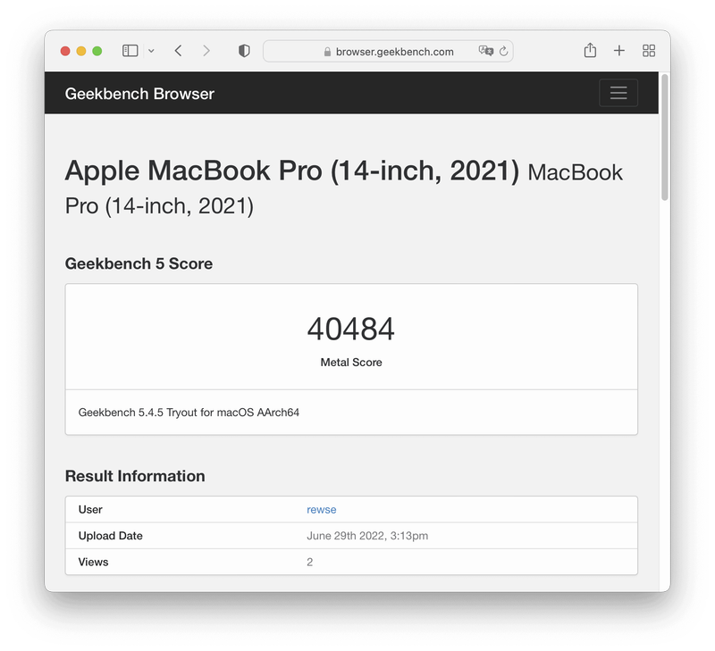 Apple M2 のMetalでの計測結果は29,832になので、M1 Pro 14-Core GPU のほうが1.36倍性能が良いです。