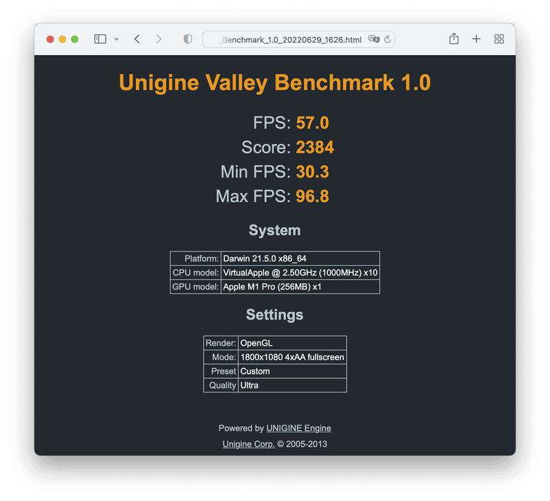 Valleyでの Apple MacBook Pro (14-inch, 2021) / Apple M1 Pro (10-Core CPU, 14-Core GPU, 16-Core Neural Engine) の計測結果