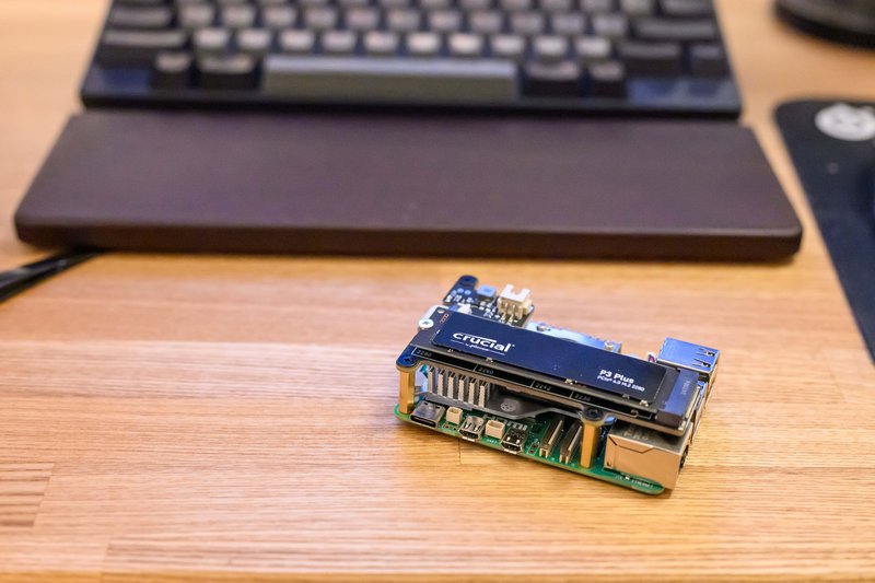Raspberry Pi SSD Kit という純正SSDもあるのですが、512GBの読取りが 50k IOPS、書込みが 90k IOPS な一方、Crucial P3 Plus 500GB の読取りは 350k IOPS、書込みは 460k IOPS 1 と段違いに良いです。ラズパイ5側がボトルネックになるので、ラズパイ5で使う分にはどちらも変わらないのですが、いつか他の機種に流用することがあった場合のことを考えて Crucial P3 Plus にしました。価格は Crucial P3 Plus のほうが安いです。読取りスループットが4,700MB/sから3,500MB/sに落ちるP3でも良かったのですが、300円しか変わらなかったので P3 Plus にしました。
