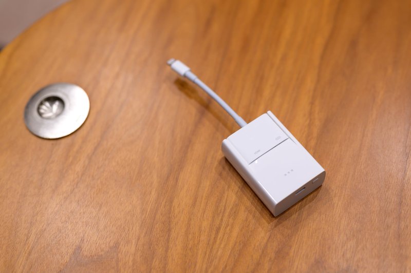 XREAL Adapter はHDMIケーブルをつなげられるものの、iPhoneをメインターゲットとしているため、Apple Lightning - Digital AVアダプタ との相性は抜群で、1個のアダプターに見えます。ただ、Apple Lightning - Digital AVアダプタ の充電用USB-Cポートが塞がれてしまうのはちょっと残念で、iPhoneを充電しながら使うにはQiワイヤレス充電する必要があります。バッテリーは3時間ほど持つので、LED1個が1時間という目安になります。30分で40%、1時間で80%、2時間で100%チャージできます。