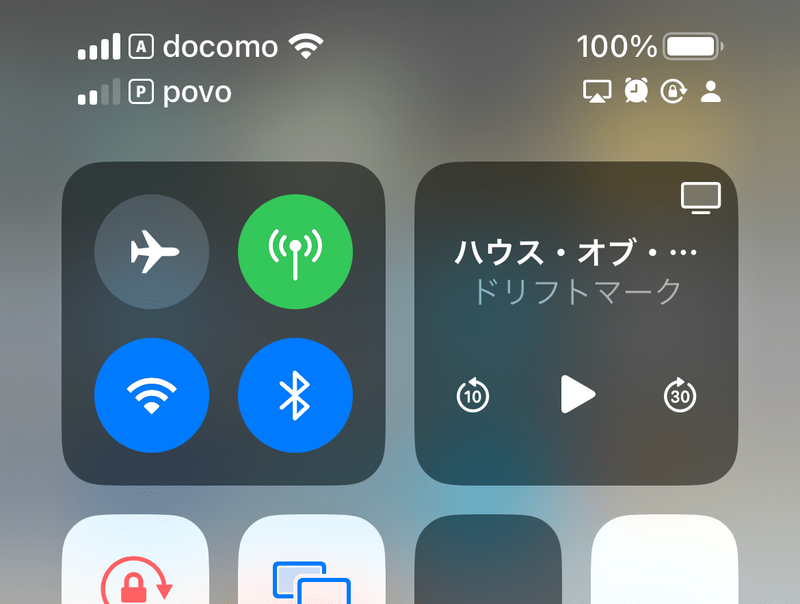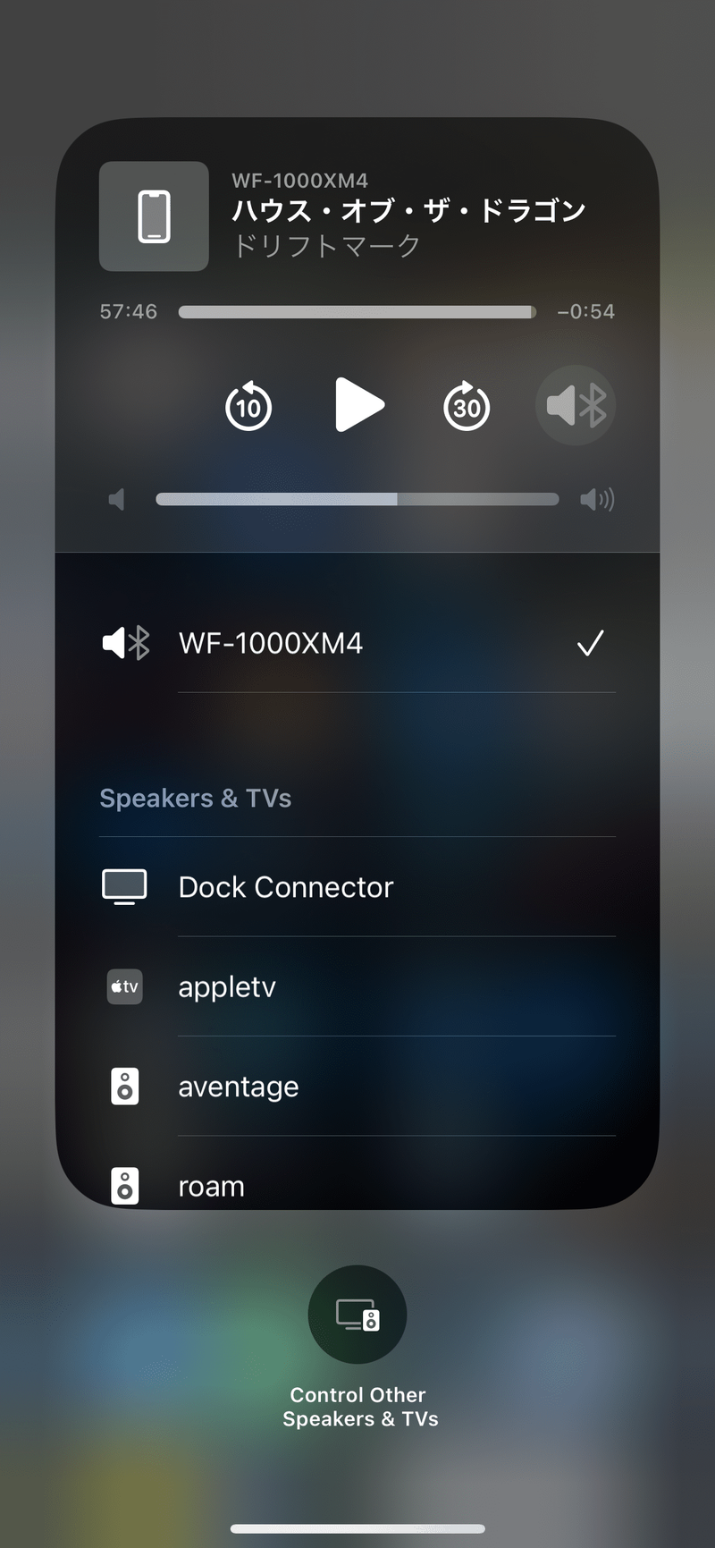 iOSのインターフェースが分かりづらいのですが、映像はLightning 、音声はBluetoothという接続も可能です。XREAL Adapter をつなぐとコントロールセンターのメディアコントロールの右上にモニターのピクトが出るので、それを押すと音声出力先を Dock Connector からBluetoothヘッドフォンなどに変更することができます。