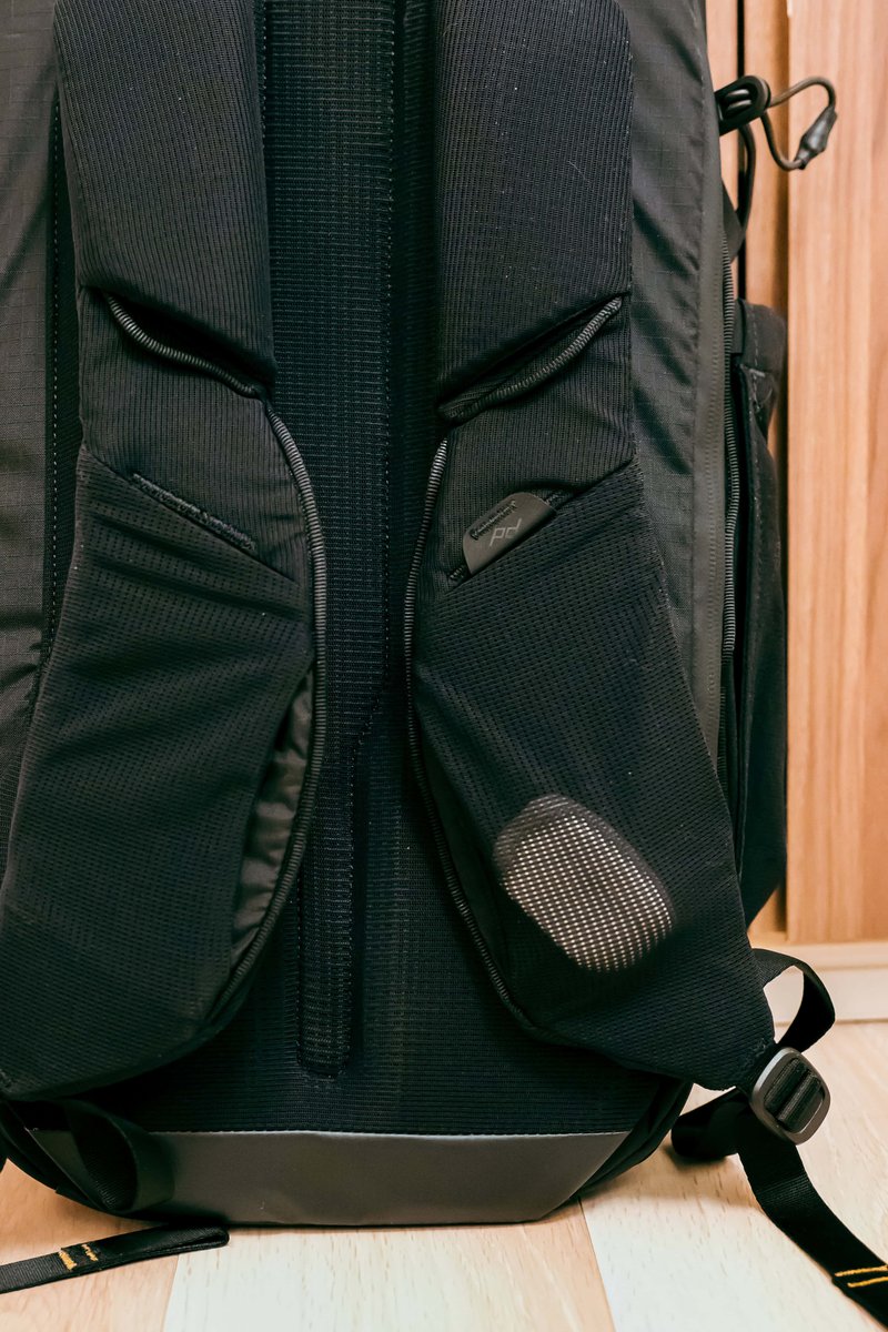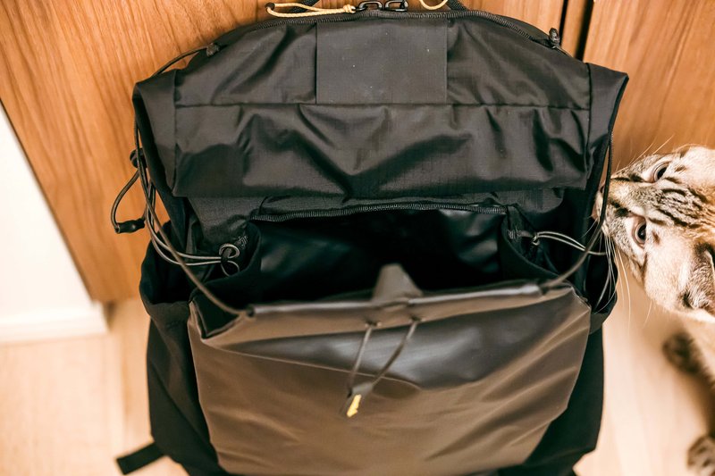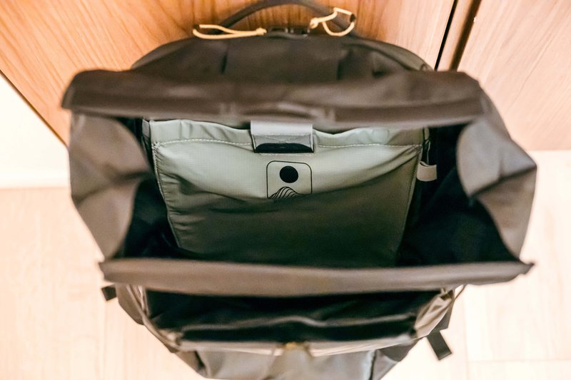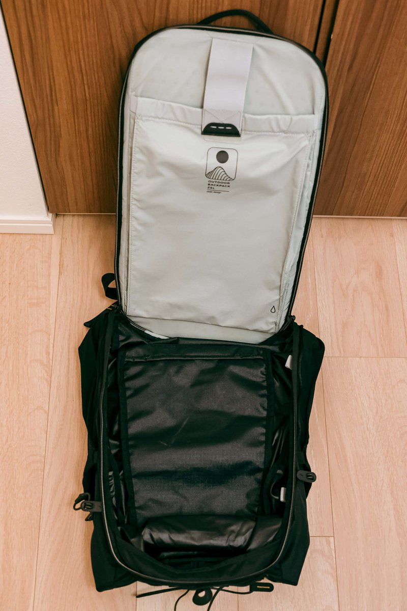 メイン収納へのアクセスの仕方は2通りあります。まずは Ultra Cinch Cord を緩めて、折りたたまれて磁石で閉まっている真上を開けるとメイン収納にアクセスできます。服などを入れる時にはここからが良さそうです。背中側にはノートPCを入れられるポケットがあります。マチは3cmほどあるので、MacBook Pro だけでなく、iPadも一緒に入れられます。