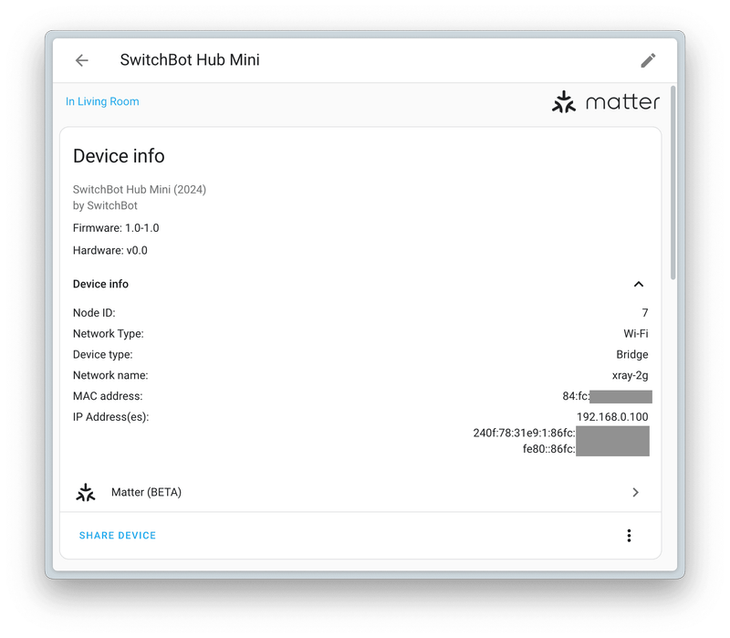 リビングの調光機能付きLEDダウンライトは Home Assistant → Nature Remo mini → Panasonic ワイド21 とったらリモコン(調光タイプ)経由で操作していたのですが、Nature Remo Custom Integration が3年以上更新されていないことと、Matter Controller である Open Home Foundation Matter Server をラズパイに立ち上げたこともあって SwitchBot Hub Mini Matter Enabled に入れ替えました。この製品は Matter Bridge として動作し、Bluetoothで接続しているSwitchBotデバイスや赤外線通信デバイスを Mater Fabric に入れられるようにします。