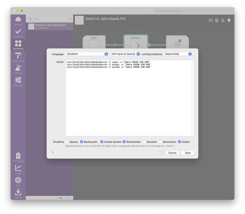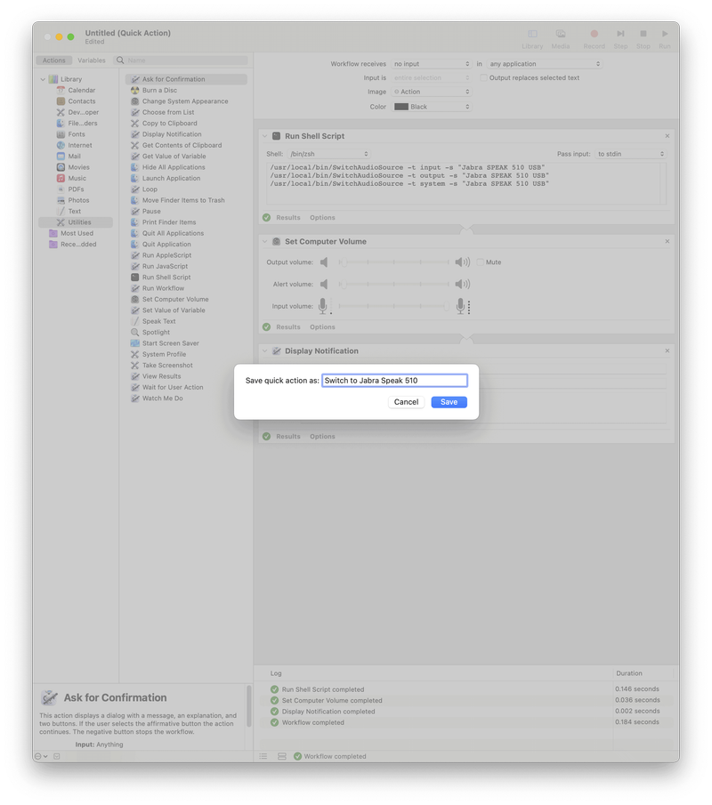 /usr/local/bin/SwitchAudioSource -t system -s "Jabra SPEAK 510 USB"右上の「実行」を押し、期待通り動作することを確認しましょう。問題なければ、名前をつけて保存します。
