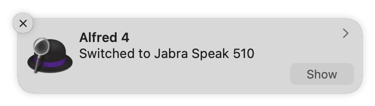 完成したら、Alfredに設定したキーワードを入力し、デバイスが変更できるかを確認しましょう。