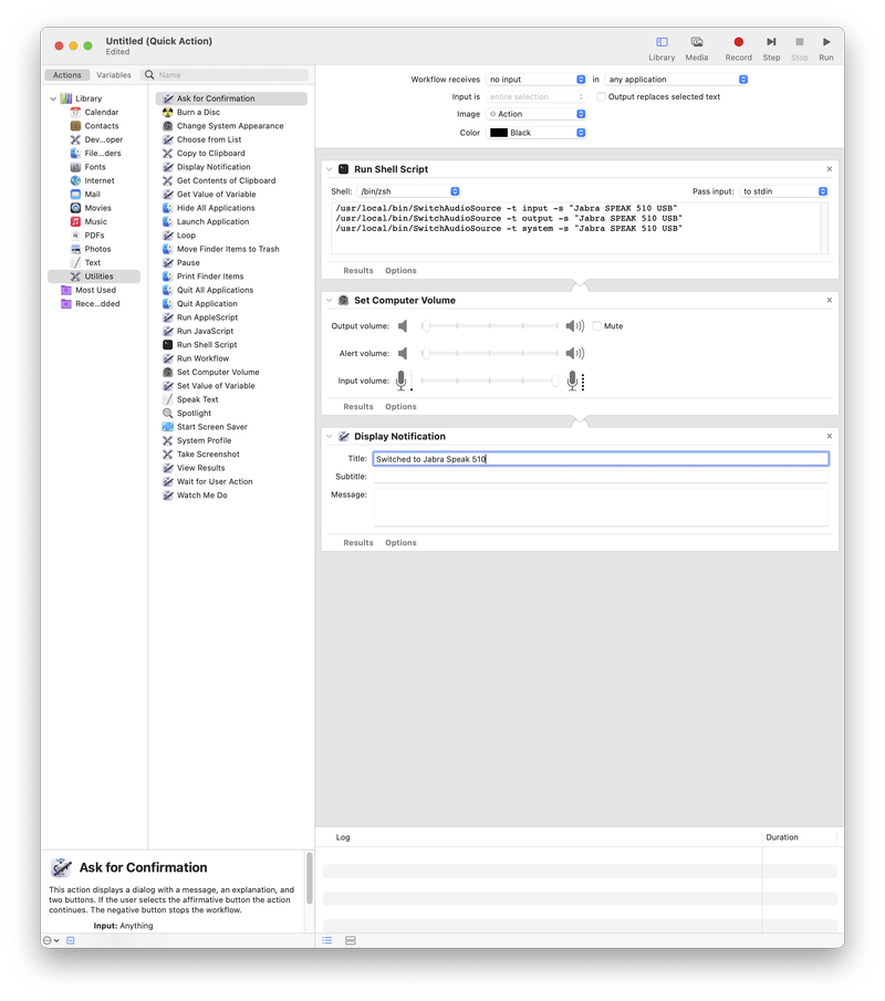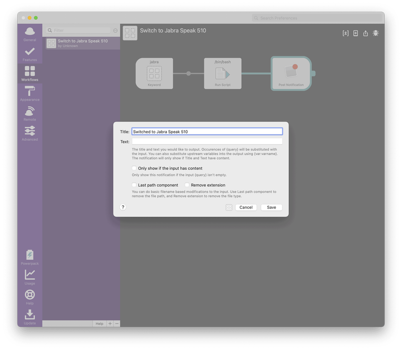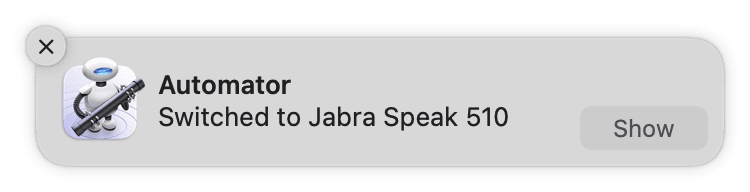 /usr/local/bin/SwitchAudioSource -t system -s "Jabra SPEAK 510 USB"Post Notification をダブルクリックし、通知に表示したい文字列を入力します。