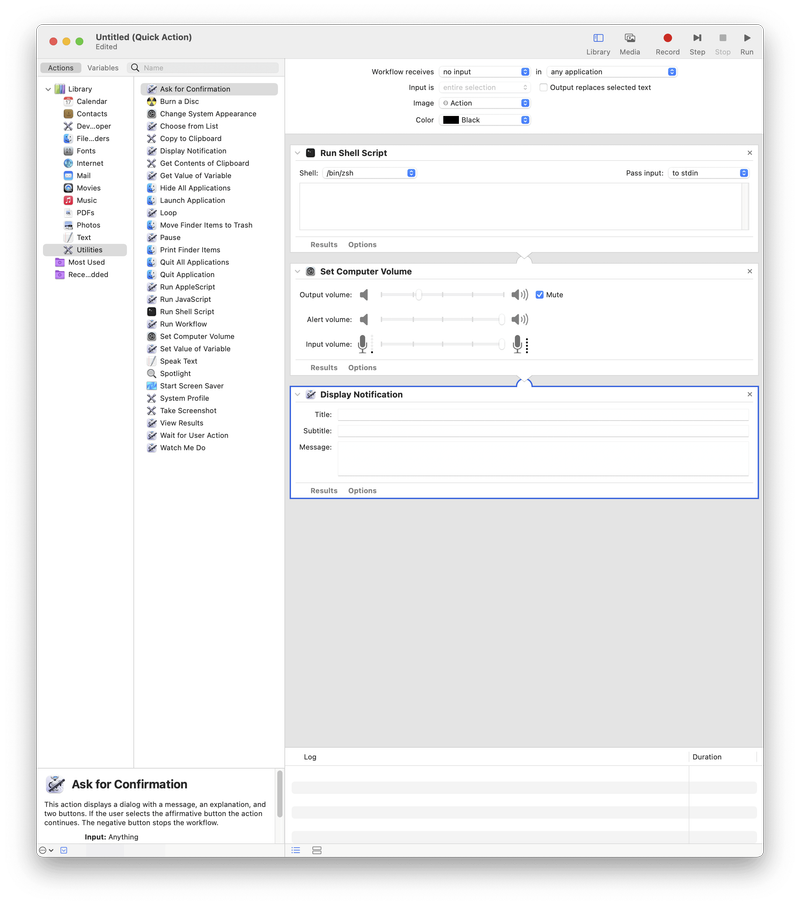 まずは、**上部の「ワークフローが受け取る項目」を「入力なし」に変更します。**その後、左パネルから「ユーティリティ」>「シェルスクリプトを実行」を選択し、右パネルにドラッグ&ドロップします。また、「コンピューターの音量を設定」と「通知を表示」も追加しましょう。