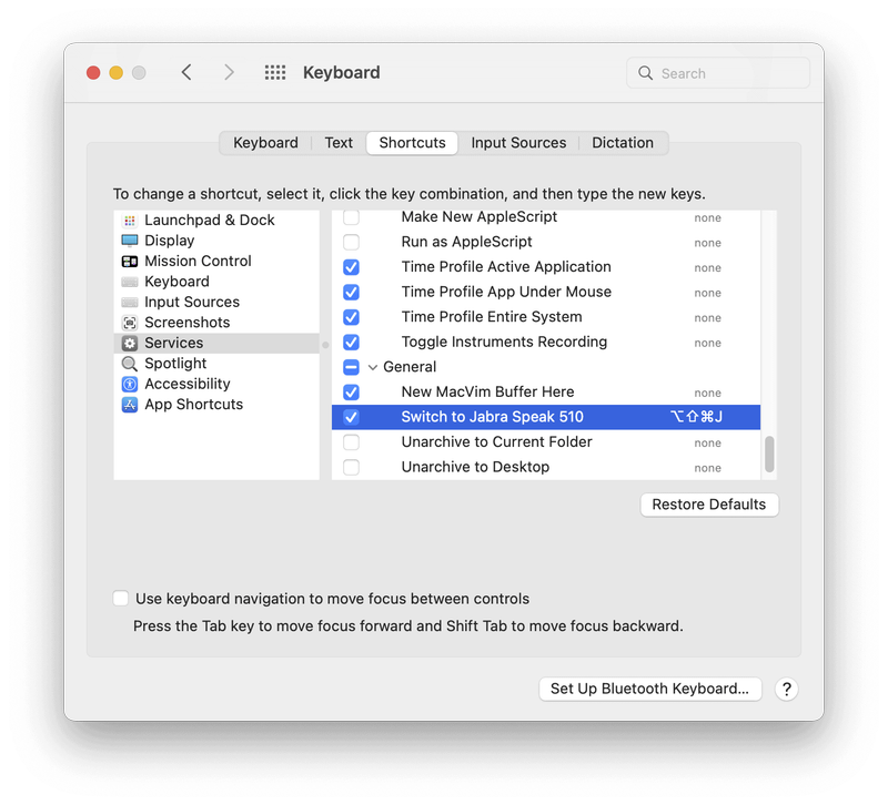 システム環境設定を開いて、「キーボード」>「ショートカット」>「サービス」を選ぶと、先ほど作成したクイックアクションが登録されています。ショートカットを追加し、そのショートカットでデバイスが変更できるかを確認しましょう。 作成したワークフローが「一般」の下ではなく「テキスト」の下にある場合は、「ワークフローが受け取る項目」が「入力なし」になっているかを確認しましょう。作成したクイックアクションの名前を右クリックすると「Automatorで開く」が選べ、修正できます。