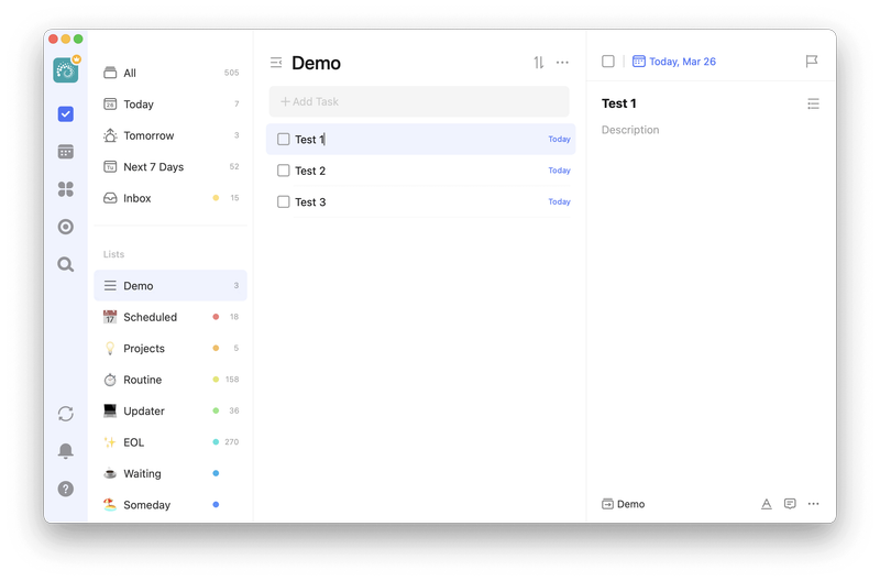 TickTick -〈Test 1〉選択時に〈Test 2〉〈Test 3〉も見えている