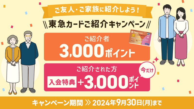 ハピタス経由で申し込みたくない場合、以下から2024/9/30までに TOKYU CARD ClubQ JMB を申し込むと、あなたと私がそれぞれ TOKYU POINT 3,000ポイント(3,000円相当)をもらえます。