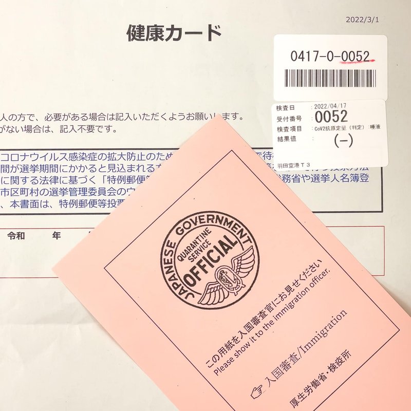 書類の確認が終わると、唾液による抗原定量検査を行います。待機場所で15分ほど待つと自分の番号が表示されるので、検査結果を受け取ります。この待機場所は、元同僚の西谷さんの 成田空港での水際対策が凄かったけど体力的にはきつかったので記録しておく - Sweet Escape によると2022年2月時点の成田空港では劣悪だったようですが、2022年4月時点の羽田空港では広大な敷地に搭乗口周辺によくあるベンチソファが大量にあり、60インチくらいのディスプレイに自分の番号が表示されるのを待つという常識的な設備でした。