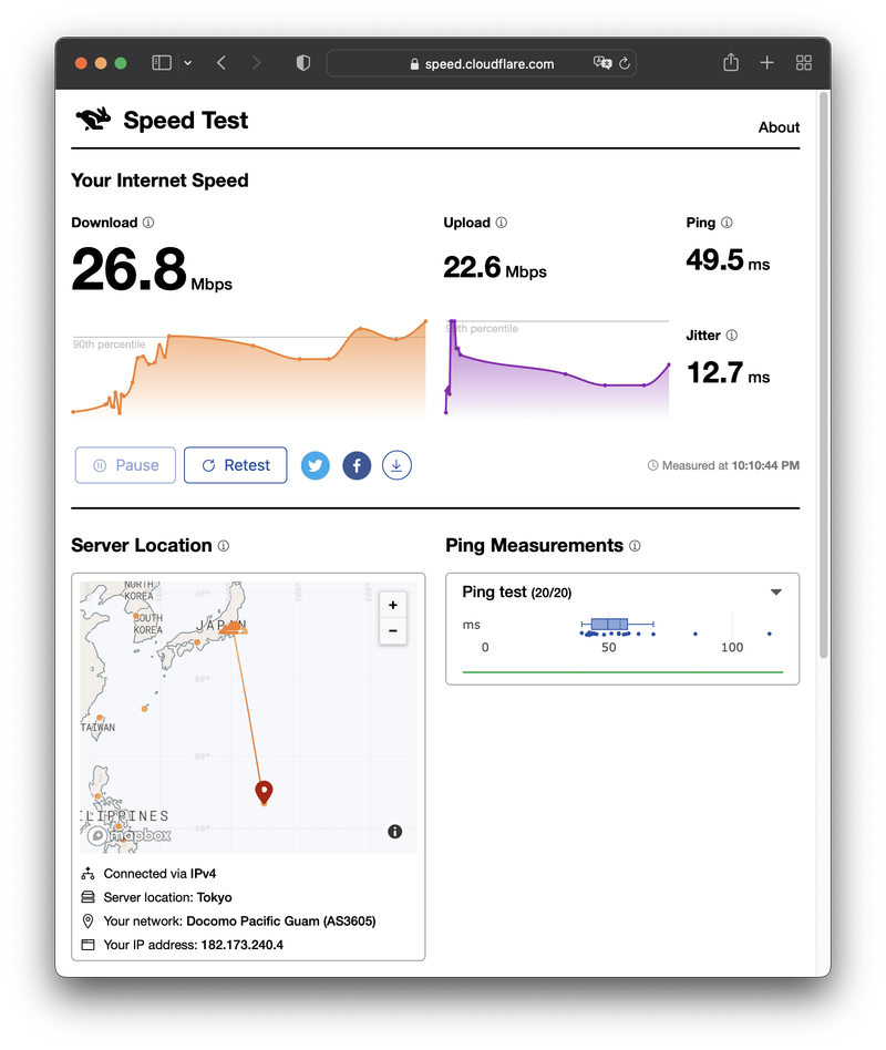 インターネットは有線LANはなく、Wi-Fiのみです。22時の時点で26.8Mbpsということで、まずまずでしょうか。余談ですが、グアムだとCloudflareのサーバーは東京になるんですね。