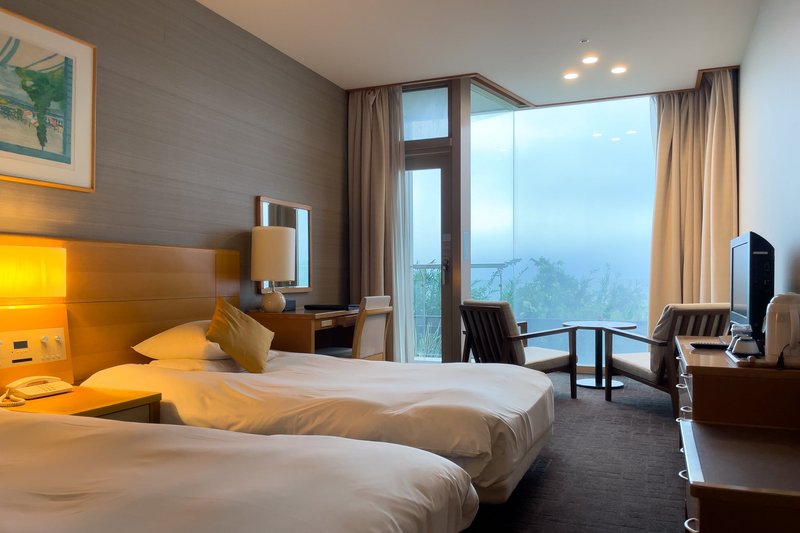 Kamakura Prince Hotel の Twin Room B は一面の壁全体ガラスになっており、目の前に相模湾だけが見える眺望の良い部屋です。少々古いところはありますが、金額次第では満足できると思います。