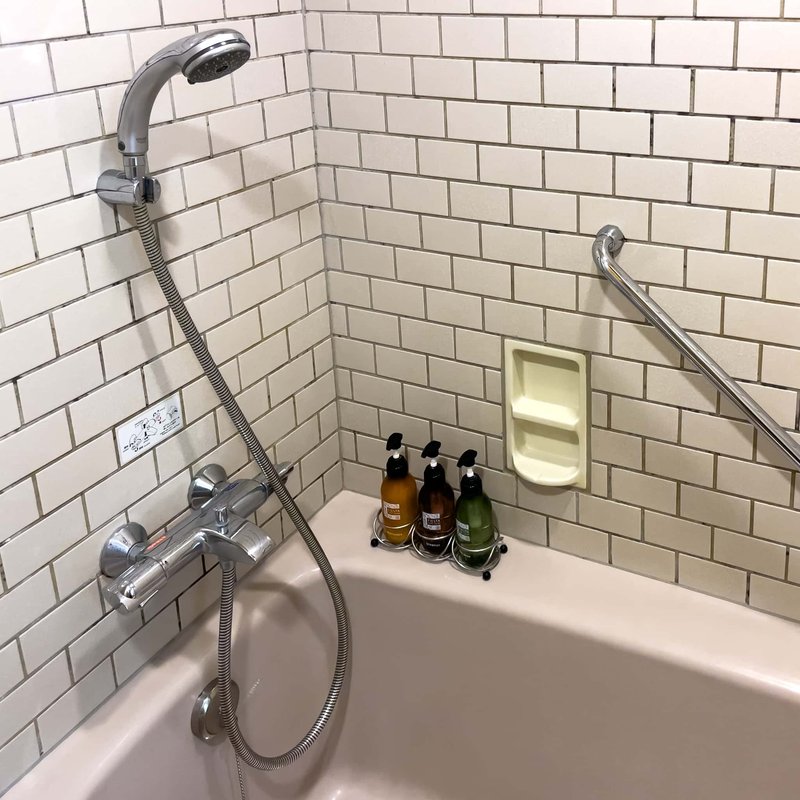 バスルームのタイルはレンガ風で、目地が黒ずんでいて少々気になります。もう少し落ちついたタイルのほうが良かった気がします。バスアメニティは Kao FIESTA PURE SHINE です。高級感はありませんが、悪くありません。