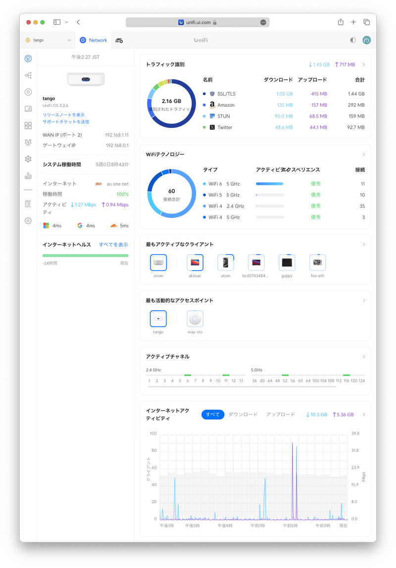 上記のNetworkアプリケーションのアイコンを押すと UniFi Network のダッシュボードが表示されます。左パネルにはIPアドレスや〈システム稼働時間〉だけでなく、〈サポートチケットを送信〉がダッシュボードにある点に好感が持てます。〈インターネット〉は回線事業者が自動認識されて表示されます。〈インターネットヘルス〉には問題なくインターネットに接続できている時間帯が緑で表示されています。