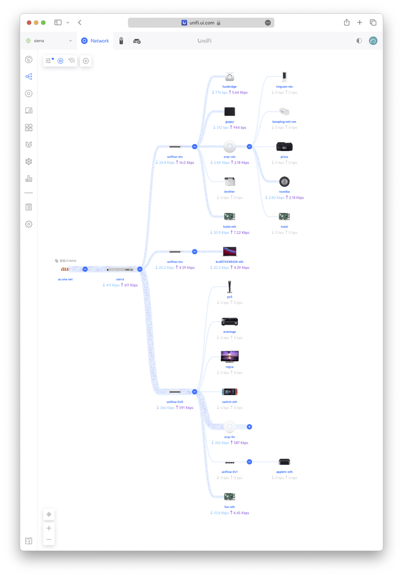 スイッチやアクセスポイントもUniFiデバイスでそろえている場合、トポロジーが自動生成されます。以下は私の環境のメインゲートウェイである Ubiquiti UniFi Dream Router Special Edition でのトポロジーを参考に掲載しますが、UniFi Express でも同様のものが作成できます。どのデバイスがインターネットトラフィックを使用しているのかもリアルタイムに表示できますし、各UniFiデバイスや各クライアントを選択すると後ほど説明するページと同様の情報が表示されます。マイナスボタンを押すとツリーが閉じて、プラスボタンを押すとツリーが開きます。