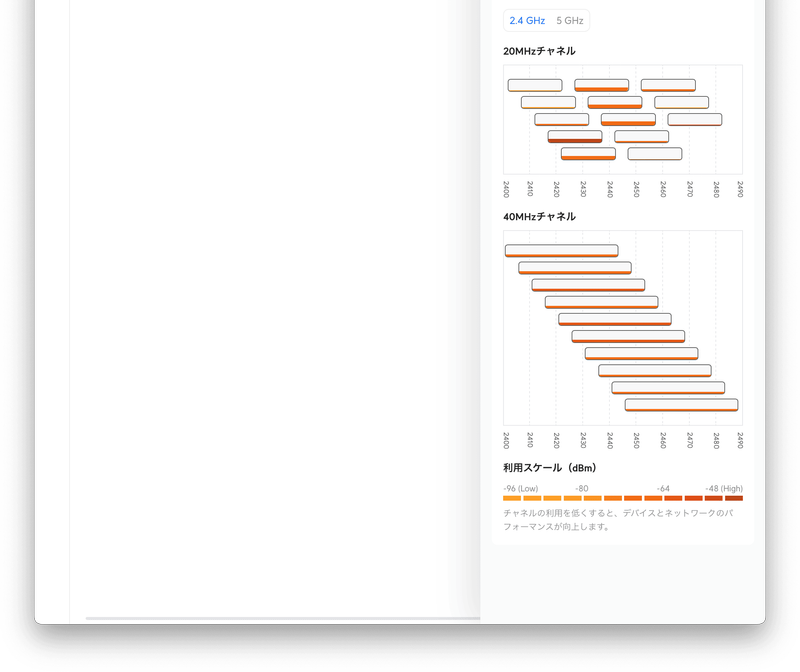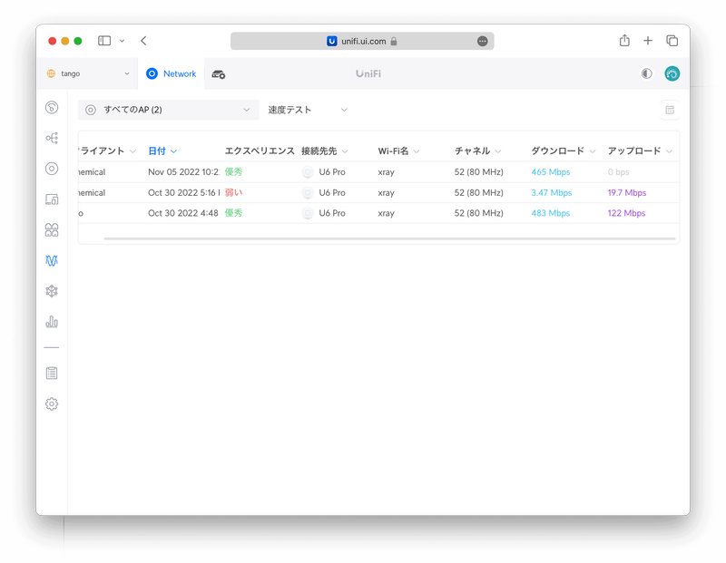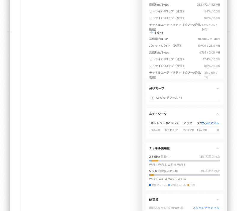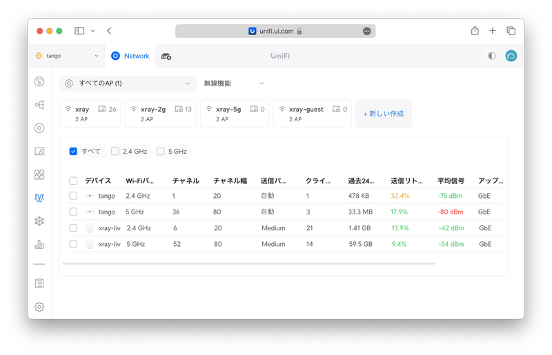 〈無線機能〉からはWi-Fiの詳細が分かります。上部にはSSIDごとのアクセスポイント数とクライアント数が表示されています。下部には UniFi Express 自身を含むUniFiアクセスポイントがチャンネル別に表示されています。以下からは UniFi Experss (tango) の2.4GHzは送信リトライが多すぎ、5GHzは平均信号が弱すぎることが分かります。つまり、UniFi Express の設置場所を変更するか、変更できない場合はアクセスポイントの増設をしたほうが良さそうです。