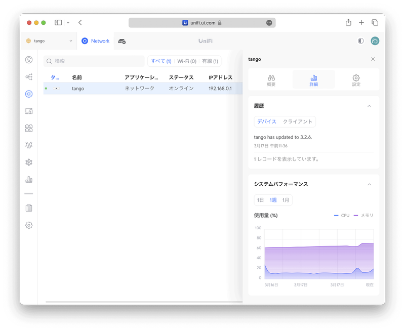〈詳細〉では UniFi Express のCPU使用率とメモリー使用率の履歴が見られます。