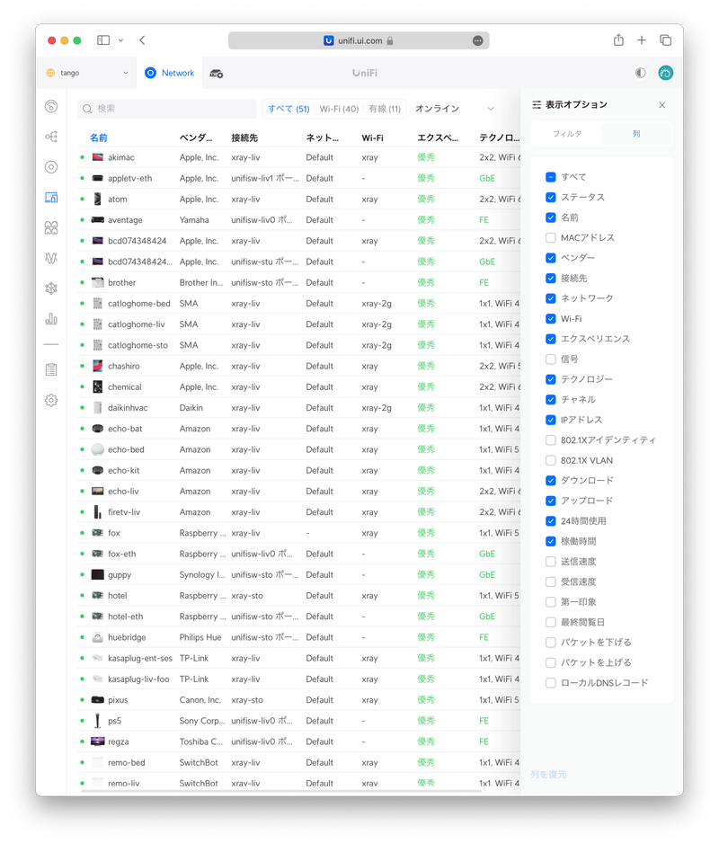 〈クライアントデバイス〉には UniFi Express に24時間以内に接続したクライアントの一覧が表示されます。アイコンや〈ベンダー〉はDPIによって(完璧ではないですが)製品レベルまで細かく識別して自動設定されます。〈接続先〉にはWi-Fi接続のクライアントはUniFiアクセスポイント名、有線接続のクライアントの場合はUniFiスイッチ名とポート番号が表示されます。〈エクスペリエンス〉はパケット再送率などを考慮したネットワーク品質を表しています。〈24時間使用〉でソートすると、ネットワークの使用量が多い順にソートできます。