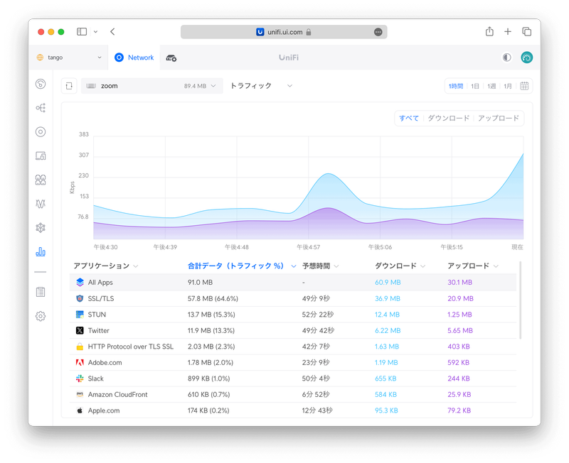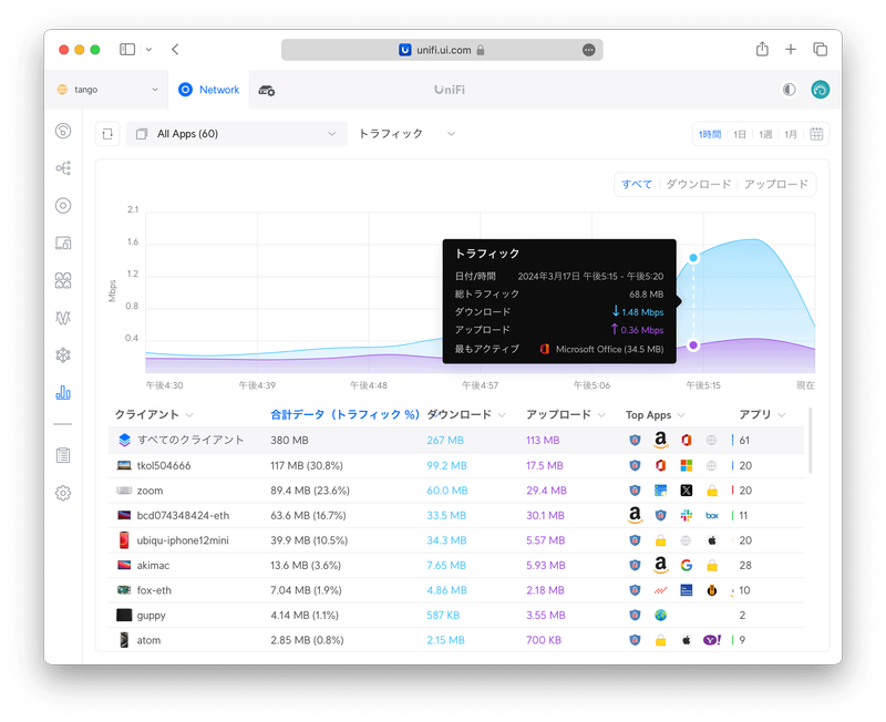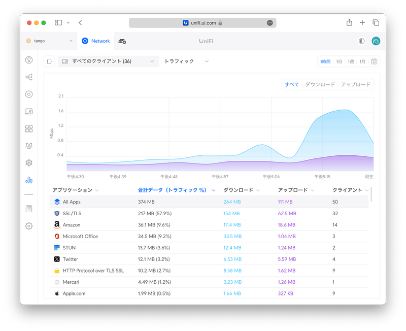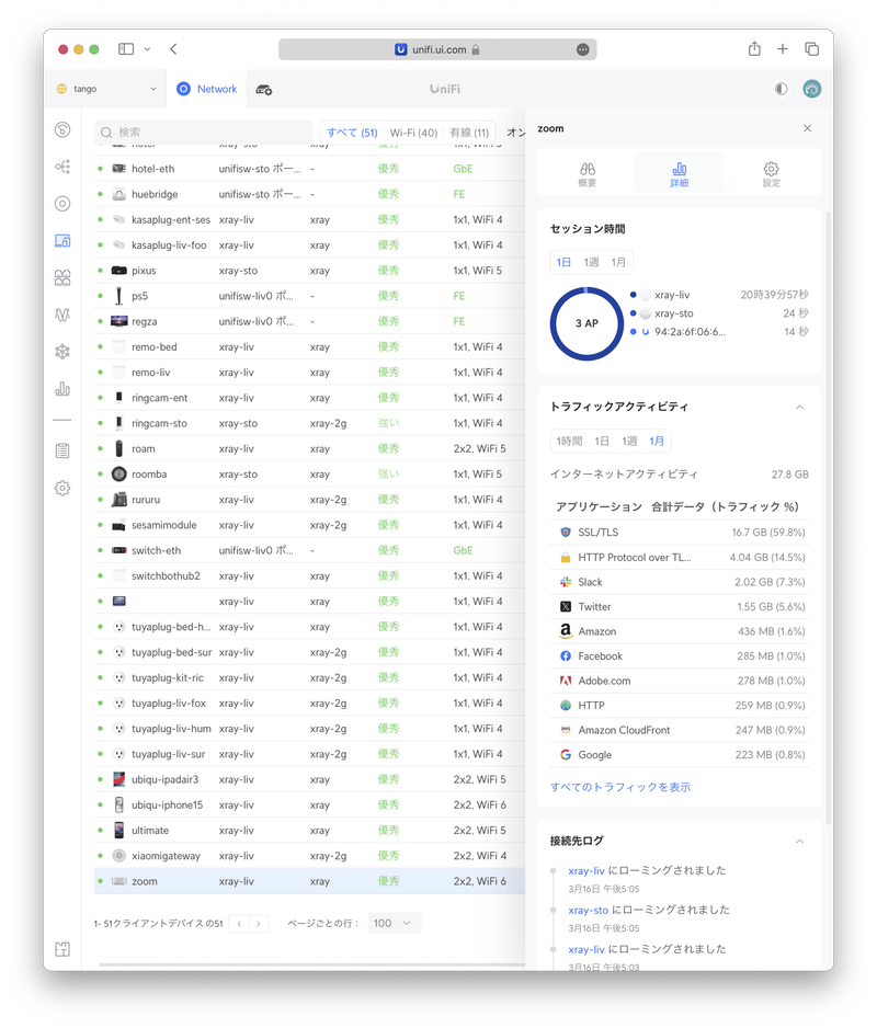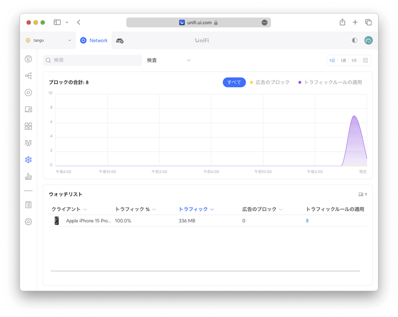 〈詳細〉タブの〈セッション時間〉からどのUniFiアクセスポイントにつながっていたかが分かるので、想定外の遠いアクセスポイントに長時間つながっているようであればアクセスポイントの電波出力を弱めたほうが良いかもしれません。〈トラフィックアクティビティ〉は、そのクライアントがどのアプリで通信していたかが分かります。たとえばIoTデバイスのトラフィックが異常に多いことを見つけた場合、この画面から通信相手を特定することができます。また、この画面から対象アプリをブロックすることもできるので、たとえば子どものクライアントのアクティビティを監視して、不適切なアプリをブロックするなどのペアレンタルコントロールが行えます。ここで言うアプリとは接続先のことなので、たとえばTikTokをブロックするとTikTokアプリもブラウザからのアクセスもどちらもブロックされます。〈接続先ログ〉からは、いつどのUniFiアクセスポイントにつながったのかの履歴が見られます。