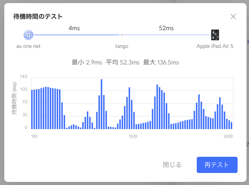 〈待機時間のテスト〉を押すとレスポンス時間の計測が始まります。以下の結果ではレスポンス時間が100ミリ秒あるときもあったり、あまり良い環境とは言えません。UniFi Express の場所を移動するか、UniFiアクセスポイントの増設を検討したほうが良さそうです。