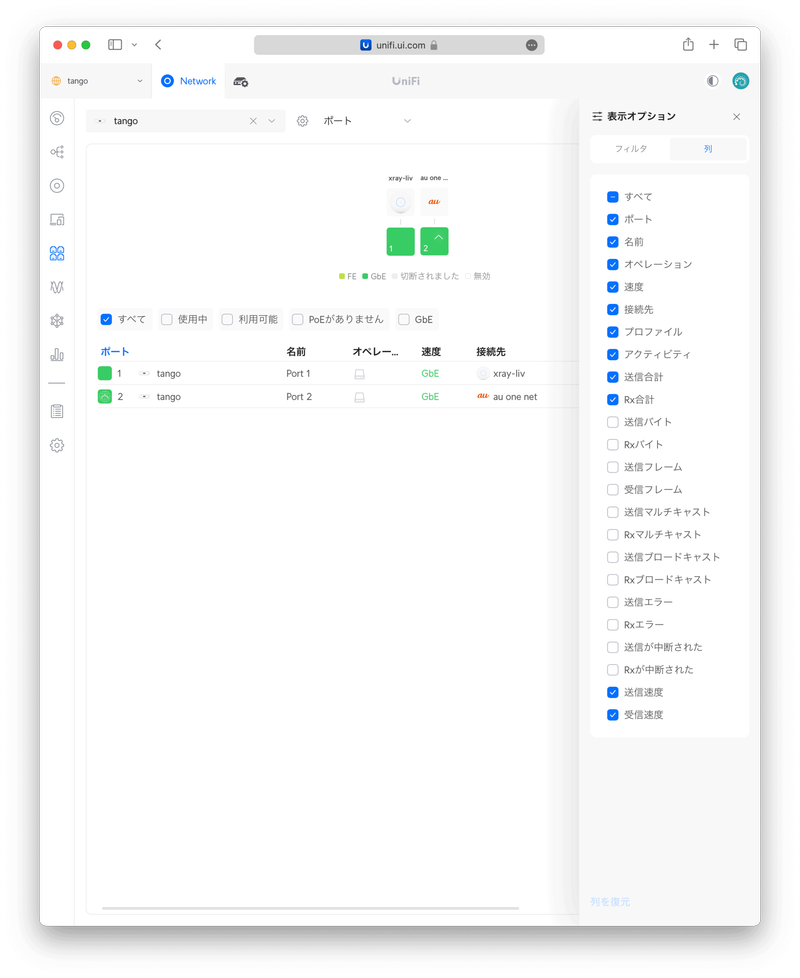 〈ポート〉からは UniFi Express のEthernetポート単位での情報が取得できます。どのポートがインターネットやUniFiデバイスにつながっているのか自動認識されます。