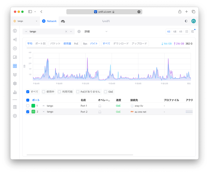 〈詳細〉を選ぶと UniFi Express 全体またはポート別のトラフィック量履歴グラフが見られます。