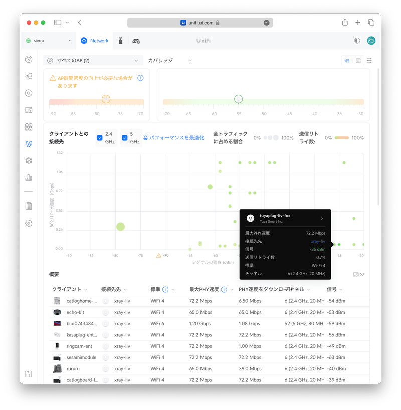 〈カバレッジ〉を選ぶと〈シグナルの強さ〉〈802.11PHY速度〉〈全トラフィックに占める割合〉〈送信リトライ数〉が一度に分かるグラフが表示されます。以下では-70dBm未満に通信量の多いクライアントがいるため、アクセスポイントの設置場所の変更が提案されています。どのクライアントに問題が発生しているかが分かるため、どこに UniFi Express を移動すれば良いか、またはどこに追加のアクセスポイントを設置すれば良いかの参考になります。