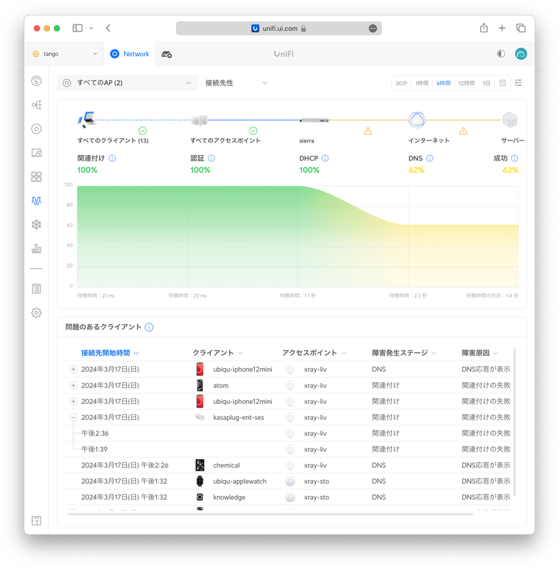 〈接続先性〉を選ぶと、どのレイヤーで問題が起きてサーバーに接続できていないのかの統計情報が分かります。以下の環境ではDNSエラーが原因で62%しかサーバーに接続できていないことが分かります。また、直近だけでなく、カレンダーから過去の日付を選ぶこともできます。